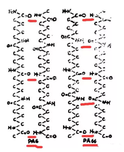 想要分析他們有什么區別,就要先從他們的結構入手,大家都知道,PA6是由己內酰胺開環聚合而成,而尼龍PA66由己二胺與己二酸縮合聚合物得到。PA6與PA66具有相同的分子式,但是結構式不同,而正是由于這點差別導致了其性質的不同,如分子間氫鍵作用力不同。